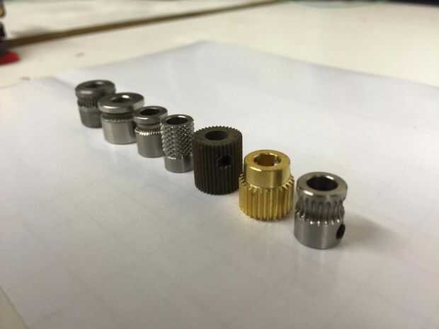 En el proceso de actualizar mi impresora 3D y preparándose para construir mi propia, decidí que necesitaba también para el diseño de la extrusora ultimate. Antes de que tomé un estilo general para el diseño, quería determinar que tenía el mejor agarre y podría aplicarse a la mayor cantidad de esfuerzo de torsión sobre el filamento. Por lo tanto, ordenó 10 engranajes distintos, diseñé un aparejo de prueba para imprimir y se puso a trabajar! Aquí está la crónica de mi búsqueda.