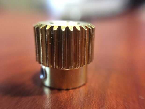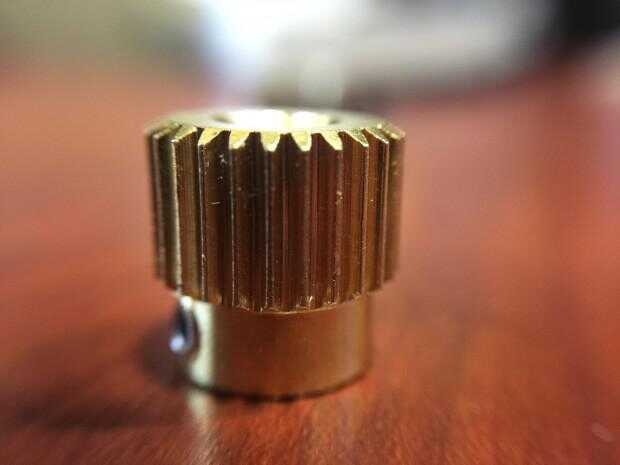 El engranaje de bronce parece reutilizar de otra cosa porque el perfil del diente ve como ha diseñado para acoplamiento con un engranaje de segunda. Éste es también diferente de los otros porque los dientes se extienden más allá del diámetro de la manga de montaje, los otros engranajes con los dientes cortados en ellos. La cantidad de picadura que esta marcha me había sorprendido, tiró más difícil de lo que se esperaba. También es útil para algunos propósitos diferentes debido a los dientes de corte rectos, no están casados a un diámetro de filamento específico o posición.