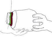 usar una máquina de tejer circular para tejer un sensor estiramiento con hilos conductores y regulares en cinco minutos! Los valores de la gama del sensor de aproximadamente 2.5 Mega Ohm cuando relajado, para 1 Kilo ohmio cuando completamente estirad
