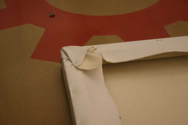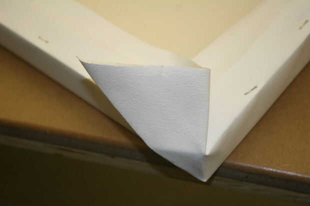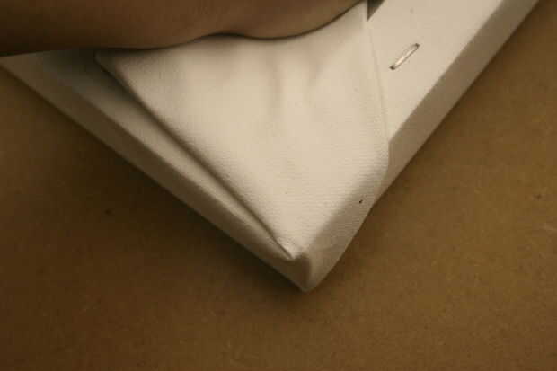 Al llegar a las esquinas, agarrar la tela Tire firmemente, gire en el lado y ponen la lona plana. Las esquinas son mucho más fácil decirlo que hacerlo. Que tenga que rehacer si no estás contento con los resultados finales. Repita en las cuatro esquinas, ahora usted está listo para pintar. Todo el mundo va a tener forma diferente un poco sobre cómo estirar un lienzo, encontrar la manera en que funciona mejor para usted.