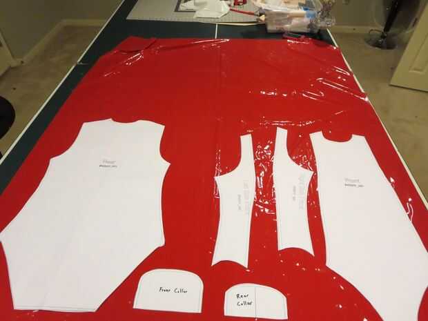 Diseño piezas de su patrón en su tela para saber el espacio adecuado para el corte hacia fuera. A continuación, corte las secciones de patrón de la tela.