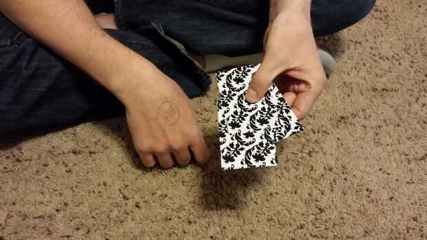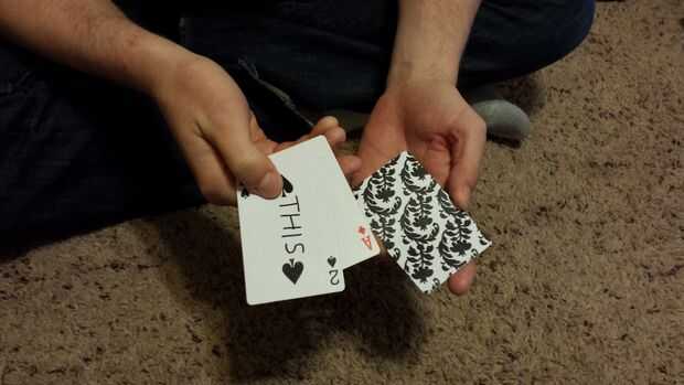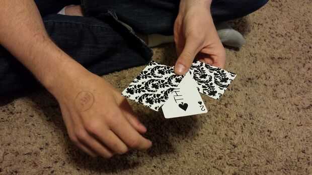 B. establece la doble ascensor en la cima de la pila y esta tarjeta cae naturalmente en el medio. Mostrar a la audiencia que esta tarjeta está de hecho en el centro.