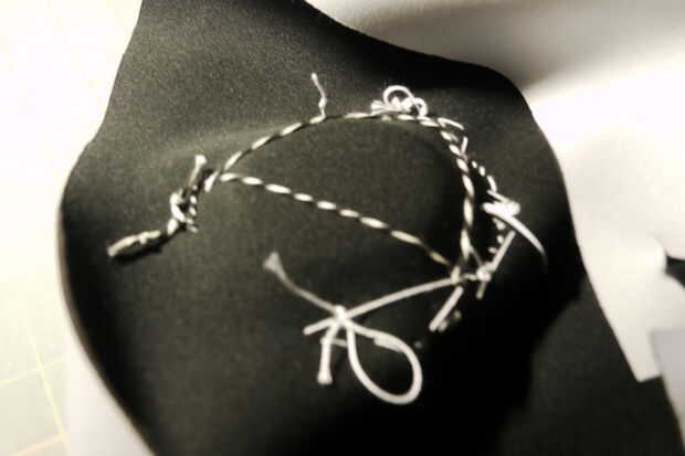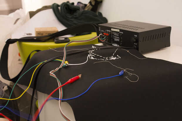 Coser una bass shaker (en este caso un 8 Ohm Pyle Bass Shaker) a la tela de neopreno. Cubrir la parte delantera de la coctelera bajo con neopreno y coser en su lugar. También puede añadir algunas agujas lana de fieltro y coser al frente para mayor comodidad del usuario.