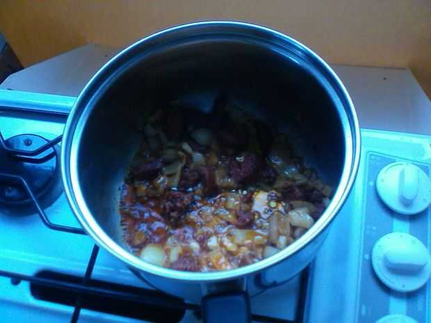 Después de un par de minutos y luego agregas el ajo y choritzo. Normalmente usaría stock para realzar los sabores de un plato de esto pero no tengo ninguno así por freír el choritzo usted liberar sabores pimentón en la sartén dándole ooomph un poco más.