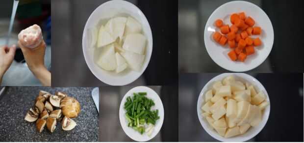 4. Corte la cebolla de verdeo, zanahorias y setas para el mismo tamaño que las patatas y la cebolla
