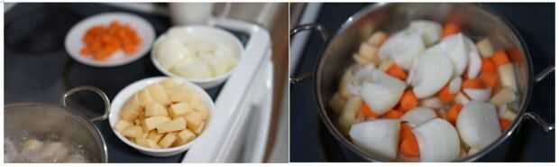 Ahora, se centrará en la adición de patatas, cebolla, zanahorias. Estos materiales pasan más tiempo hasta que estos se realicen casi para que pongan en primer lugar.