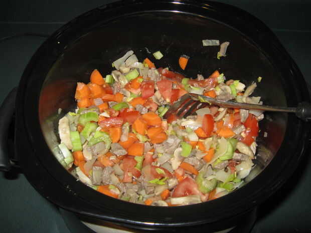 Después de agregar la punta de solomillo soldadas a la olla de 6 cuartos agregar la zanahoria picada, el tomate y el apio y añadir a la olla.