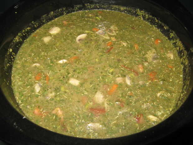 Añadir el agua, tapar y cocinar a temperatura media durante 8 horas o hasta que las verduras estén tiernas.