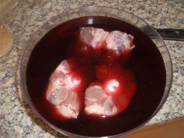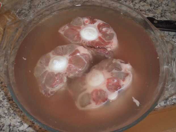 Primero Remoje el rabo de buey en agua con sal durante una hora o dos, luego deseche el agua y sustituirla por un delicioso vino tinto. Usé Vapollicella. Y dejar en adobo, durante unas horas, o mejor aún durante la noche.