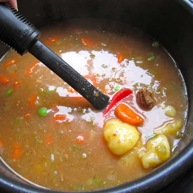 Una vez que se haya disuelto la maizena, vierta la mezcla en el guiso.