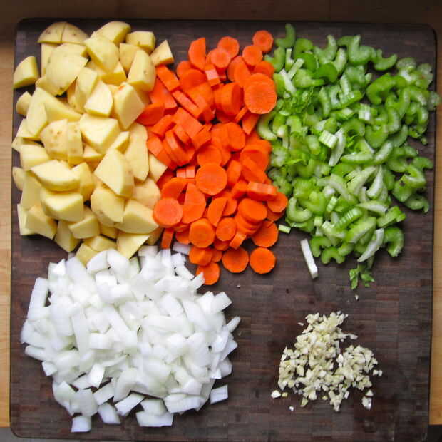 me gustaria cortar el apio y cebolla más fina y deja las zanahorias y las patatas en trozos grandes. Sólo tener en cuenta que los más pequeños cortan cosas, más probable son cocinar tanto caen aparte. :)