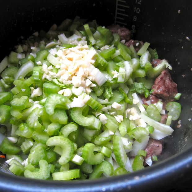 Una vez hecho, añadir el apio, la cebolla y el ajo y mezcle bien. Cocinar, revolviendo con frecuencia, hasta que las cebollas comiencen a llegar ligeramente translúcido.
