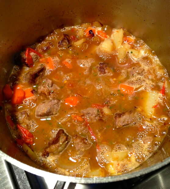 los ingredientes:2 cebollas grandes3 tomates grandes o 5 Tomates ciruela2 pimientos3 zanahorias2 tallos de apio6 patatas rojas pequeñasmaíz 1fresh (extraído de la mazorca)1 taza de guisantes1 1/2 libras de carne de res en cubos y enharinado1 lata de