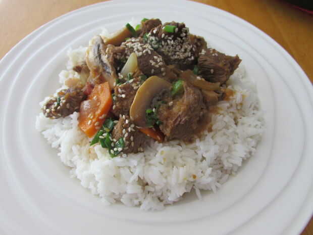 Mi hijo le encanta este guiso porque es muy dulce debido a las peras y absolutamente delicioso con arroz jazmín.