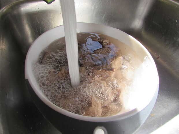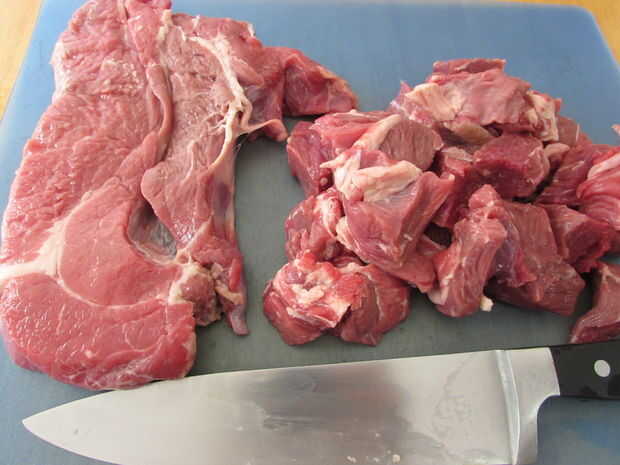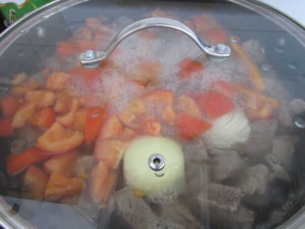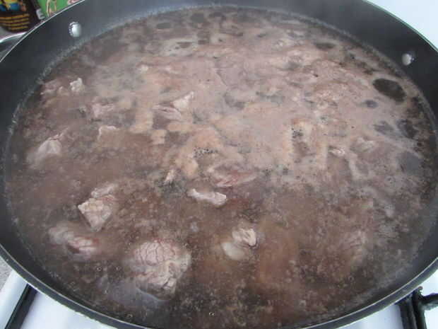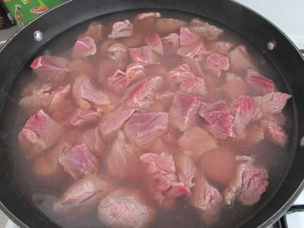 Corte la carne en cubos de 1 pulgada recorte de tocino luego hervir en una olla de agua durante 15 minutos. Transcurrido este tiempo, se pueden ver en la 3ª foto la espuma y la grasa flotando en la parte superior. Retire la carne de vacuno y sumérjalo en agua limpia para eliminar la sangre y la grasa adheridas todavía en él y drenaje. Deseche los utilizados agua hervida.