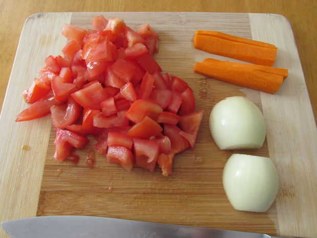 Picar dos tomates, cortar la mitad de una zanahoria y una cebolla la mitad. Poner en una olla de agua hirviendo con la carne de vacuno. No mido la cantidad de agua en la olla, sólo asegúrese de que el nivel cubre la carne. Cocinar a fuego lento con la tapa en a fuego lento durante 1 hora y 30 minutos o hasta que la carne esté blanda al tenedor. Después de lo cual, puede sacar la carne y guardar una taza de caldo. (foto 7)