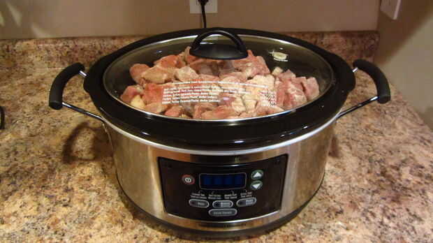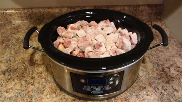 Vierta la carne encima de la mezcla de verduras en la olla y espolvoree con un poco de condimento de sal.