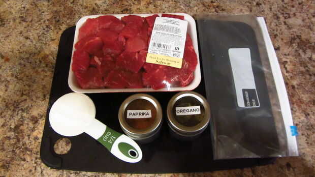 Tomar su carne guisado, que deberá cortarse en cubos de 1 pulgada, vacíos lo en la bolsa del congelador y agitar hasta que haya cubierto toda la carne.