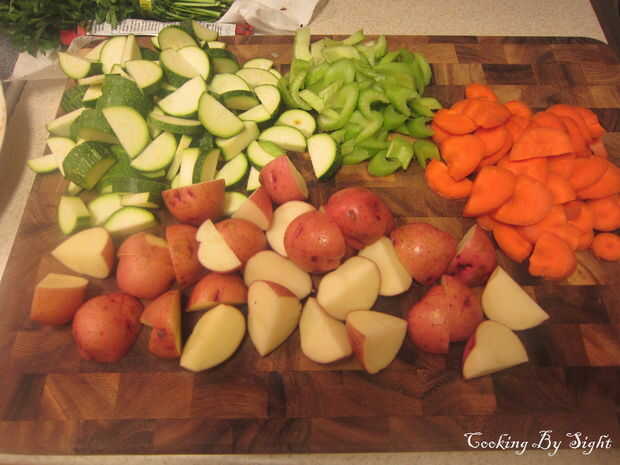 Esto le da tiempo suficiente para cuidar el resto de su trabajo de preparación. Reducir a la mitad los calabacines y cortarlas alrededor de 1/4 pulgada de espesor. Hacer lo mismo con las zanahorias. Cortar el apio en diagonal (en un ángulo - esto le ayuda a mantener su forma mejor a lo largo de la cocción), también cerca de 1/4 pulgada de grueso. Cuarto de las patatas. Os dejo las pieles en porque me gusta el look y gusto y valor agregado de la nutrición, pero si prefieres pelar antes de acuartelamiento, por todos los medios por favor no.