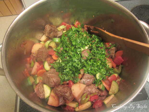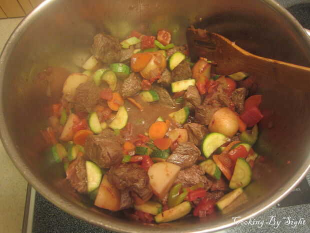 Permita que el guiso a fuego lento a fuego lento durante otra media hora después de añadir los tomates y los vegetales. Luego añadir las judías verdes (generalmente añadir ellos mientras siguen congeladas - apenas aumentan el calor para llevar el guisado a fuego lento). Tapar y cocinar hasta que estén apenas tiernos. También, si el puchero parece a Aguada cuando se revuelve en los frijoles, añadir la pasta de tomate para espesar un poco. Unos 30 minutos más, y su guiso debe estar listo!
