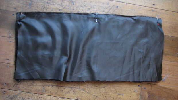 Perno de una de las guarniciones pequeñas a una piel pequeña pieza a lo largo del borde superior (donde se corte de la pieza más grande de la piel) derecho contra derecho y coserlo 1cm desde el borde con puntadas de mediano y largo. Hacer lo mismo con el otro pedazo pequeño de piel y forro pequeño otro.