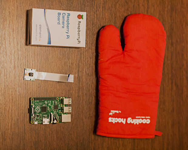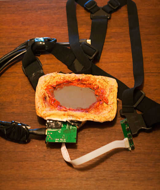 - Frambuesa Pi se coloca en la parte trasera de la camiseta y la cámara se coloca por encima.