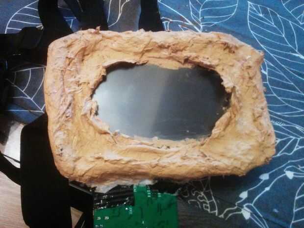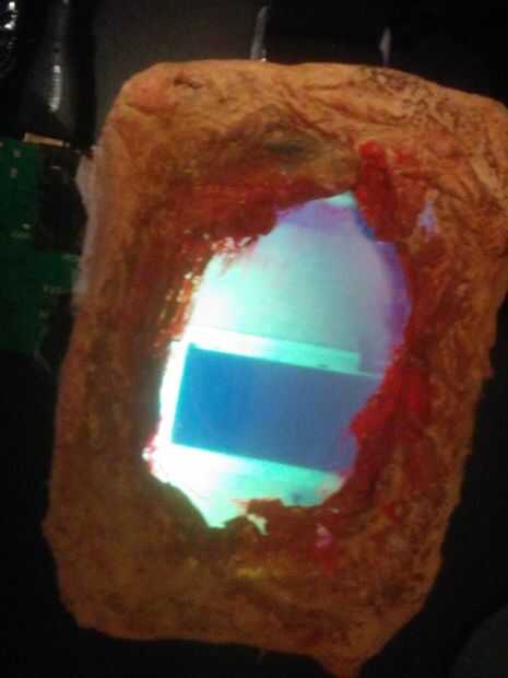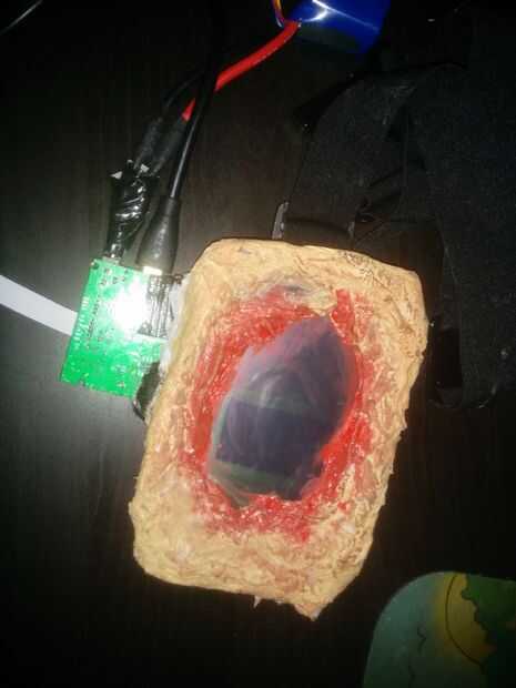 También usamos una camiseta blanca. Cortamos 2 agujeros, uno más grande en el frente de la camiseta (un poco más pequeña que la pantalla) y otra por detrás para poner la cámara. Más tarde, puede pintar la camiseta con pintura roja como si fuera a sangrar.