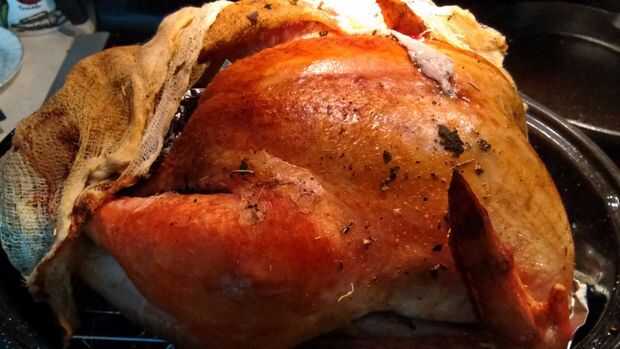Cuando el pavo se ve así - bastante uniformemente y maravillosamente dorado - Retire la estopilla y déjelo cocinar destapado por sobre otros 20-30 minutos.