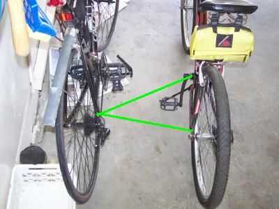 Si dos motos van a estar emparejados como esta, el refuerzo no puede interferir con el normal movimiento de los pedales, los pies y las piernas. Este esquema asume que viajaran en el jinete de la bicicleta de la izquierda. El apoyar puede dar la vuelta si fuera el ciclista en la bicicleta de lado derecho.