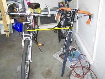 La parte delantera de dos bicicletas tendrán que ser atados. La línea amarilla muestra aproximadamente donde los frentes de las bicicletas podrían ser Unidos a mantener la separación frente al igual en la parte trasera.