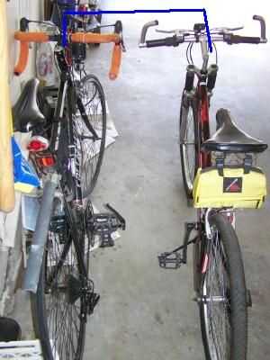 Las potencias en ambas bicicletas podrían vincularse por medio de una extensión y un tirante de conexión similar al diseño usado en un automóvil. Ver las líneas azules. El manillar en la bicicleta montado no se podía quitar.
