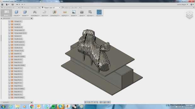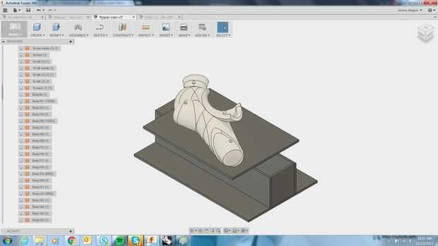 Para la orientación volteada usé tacos de madera de 1" para apoyar la forma irregular. En fusión creó una línea de boceto para servir como eje de la rotación, luego duplica y rotar la geometría. Modelado y localicé 4 espigas hacia los grados de la forma y utiliza cosechadora > corte para sustraer la forma de espiga de 1/2" profundamente en el modelo. Luego volcó el modelo a lo largo del mismo eje y había creado una operación aburrida como paso final para el mecanizado de la primera orientación creando los orificios para taquetes. Del mismo modo para configurar 1, hice un 2.o bosquejo proyectan los lugares pasador sobre el perfil de la placa. Ahora la placa tendrá ubicaciones grabada con láser para la plantilla de la primera orientación y los postes para la población de los bancos. Esto me dio 4 puntos de fijación precisa de la geometría irregular para que se sepa exactamente donde la acción es en el espacio después de girar. Corté los tacos con una tronzadora a las dimensiones extraídas de fusión y hacer algunos collares con Shopbot de MDF de 3/4" para mayor rigidez y atornillando los inmuebles.