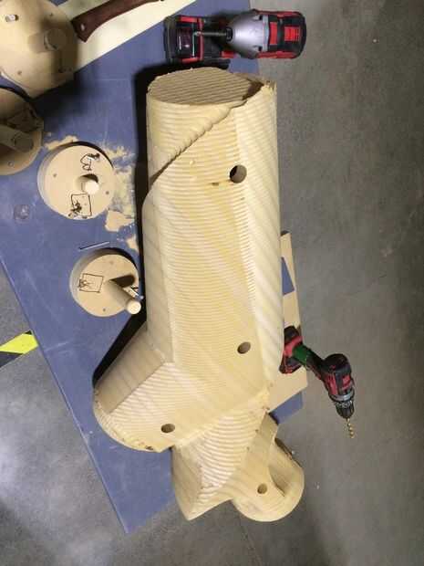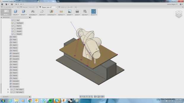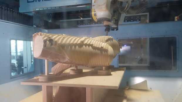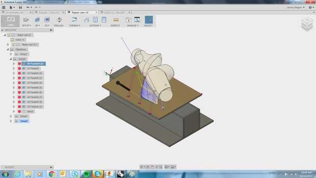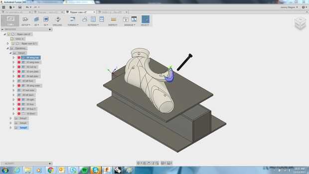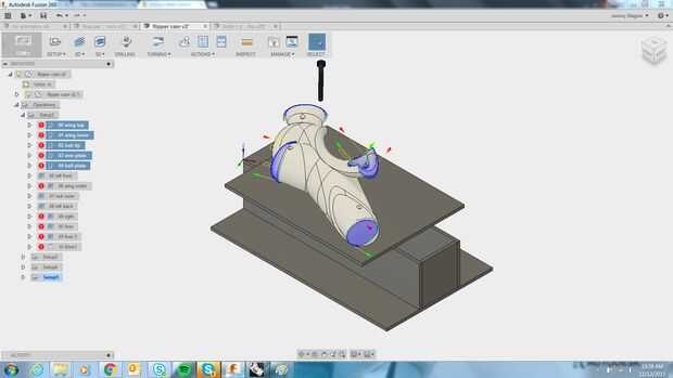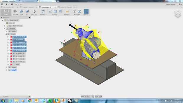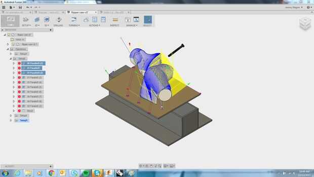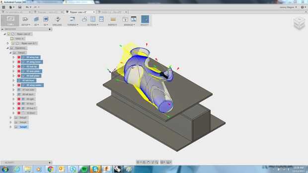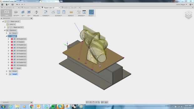 Misma estrategia de programación con configuración 1 - mientras que el DMS ofrece articulación de eje 5, mis trayectorias fueron creados con una estrategia de eje '3 + 2' en lugar de verdadero eje 5 que me permitió permanecer en la fusión (fusión no ofrece 5axis programación todavía). Verdadero eje 5 programación, yo habría utilizado HSM Pro para Inventor o FeatureCAM de Delcam. Esto significa que cada operación tiene una orientación fija z. Para llegar a todas las superficies y rincones, me pareció mejor romper el paso en absolutamente algunas orientaciones para mantener la herramienta como normal a la superficie como sea posible.