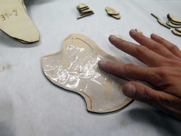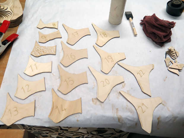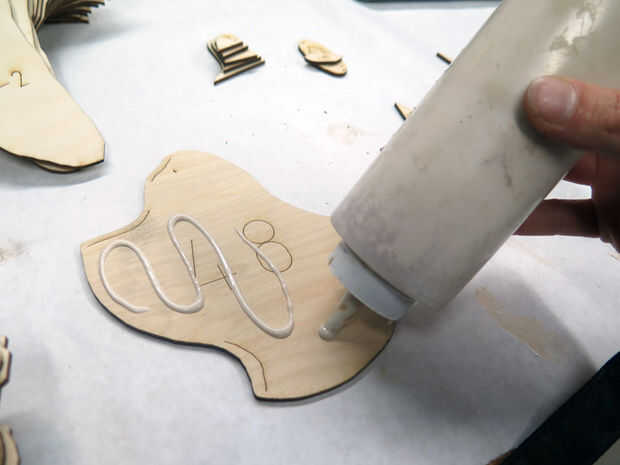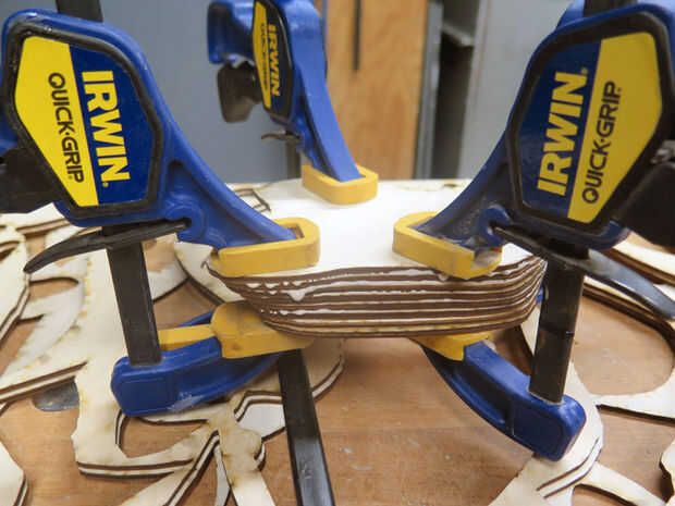 Una vez todas las piezas son laser cut, empieza a organizar en secciones que pueden pegarse para arriba en pilas. Para este paso necesitarás pegamento de madera, un trapo húmedo para limpiar pegamento exprimir y un montón de pinzas! Me gusta Quick-Grip y abrazaderas de resorte para una cola más pequeña ups como esto. A pegar las piezas en pequeñas pilas que eventualmente se pega en una forma sólida de madera apilada. Esto requiere cierta planificación para asegurarse de que usted puede sujetar piezas posteriores juntos.