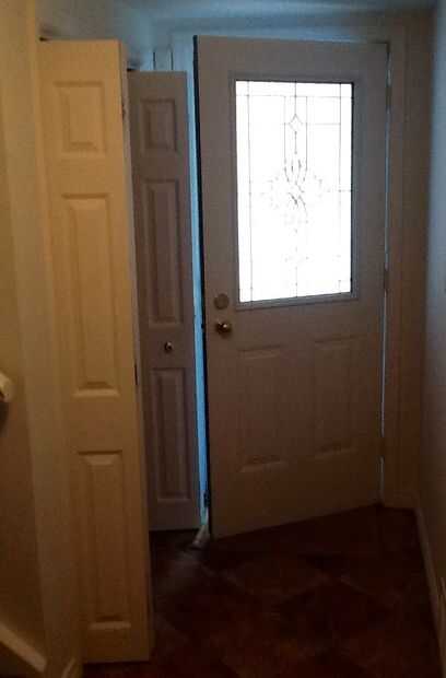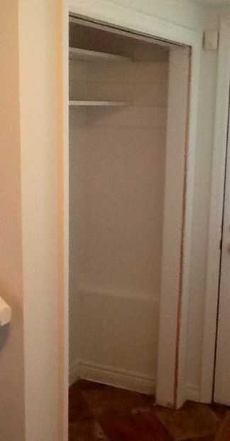 tuve un estrecho pasillo con una puerta de entrada principal y un armario con puertas bifold cerca uno al otro. Biptico abierta, la puerta de entrada golpearon y utiliza demasiado espacio, especialmente cuando los huéspedes visitaron. Primer paso fue quitar el Biptico y todo el hardware. Se conservaron las molduras existentes, como fueron el interior estantes superiores.
