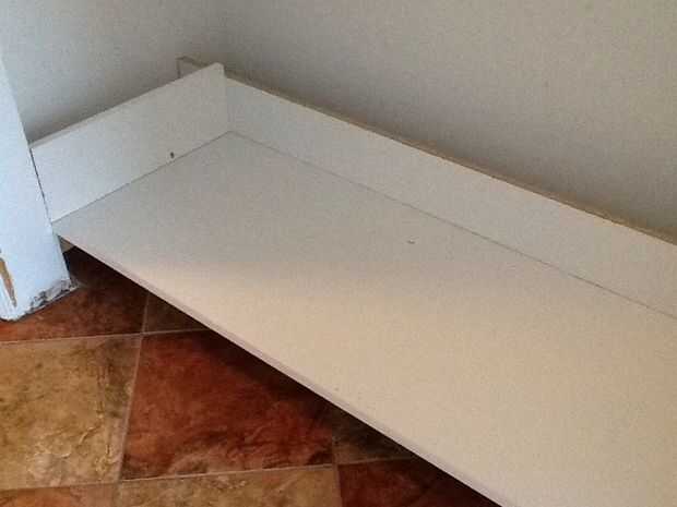 he utilizado 3/4 MDF melamina escritorio. Vino en 5'x 30" piezas. Fue rasgado para caber los cestos 4 inferior y utilicé la izquierda sobre las piezas para proporcionar una parada para las cestas en la parte posterior y los lados. Arrancó algunos pinos a 5" y la clavó a la moldura interior existente. Esto permitió que la plataforma para sentarse 5" del suelo proporcionando almacenaje del zapato escondido debajo.