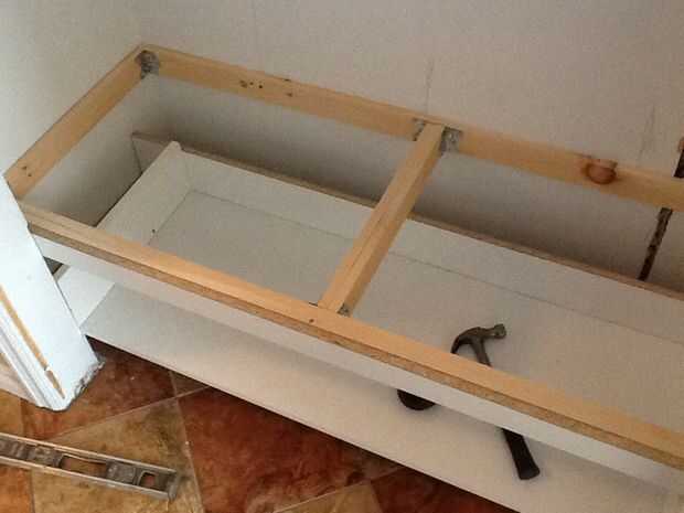 Ya que utilicé la misma melamina MDF de 3/4 para el asiento, que necesitaba apoyo. Para ello, arrancó pino 3/4" a 2", había doblado para arriba y había atado a los postes con tornillos de construcción. Hice un robusto soporte doble en el centro que es donde más peso. También arrancaron 2" pieza de melamina para proporcionar una facer en la puerta. 2" era proporcionar suficiente espacio para las cestas de 10" y 5" zapatos de almacenamiento, así como el grosor de ambas piezas de melamina. Esto dio una perfecto estándar 18" altura del asiento.