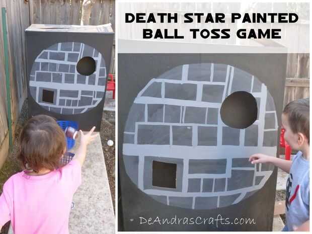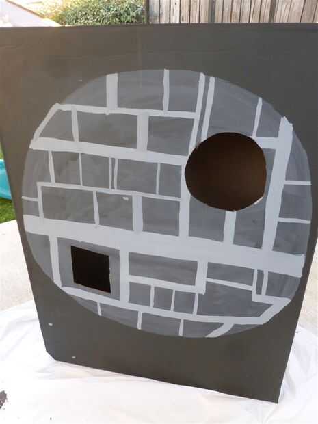 Para el tercer cumpleaños de mi hijo menor, he pintado una versión sencilla de la estrella de la muerte de Star Wars en una caja de cartón como parte de un juego de lanzamiento de pelota.