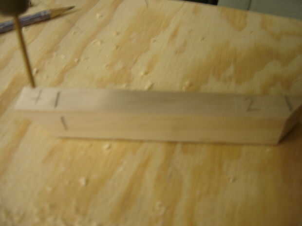 Utiliza la escuadra de combinación y ajuste 3/8 de una pulgada. En un extremo, hacer dos marcas perpendiculares en 3/8ths. Se trata de desgaste que te taladra.