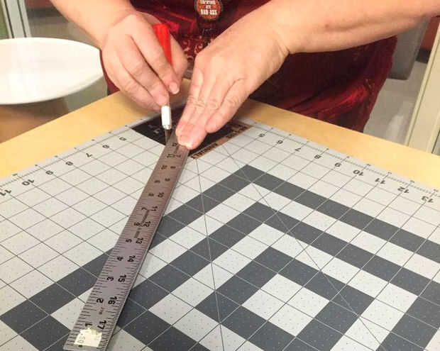 Alinee la plaza a una esquina de la alfombra y la puntuación (marca la hoja con el cuchillo sin piercing, simplemente corte en la superficie) la hoja en 30, 45 y 60 grados de ángulos.