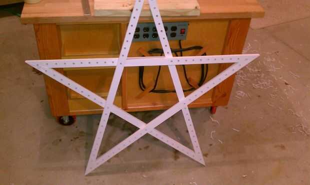 Desde que tuve (2) cuerdas, rellena la estrella todos los agujeros. Esto podría ser un cool efecto de iluminación una o la otra cadena y todavía tienen forma de estrella. (Creo que TSO y un secuenciador de luz) También resuelve el problema de los cables agrupados para arriba.