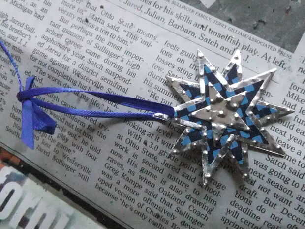 Este fue mi diseño de ornamento de la Navidad de 2010. Hice muchos de ellos, así que valió la pena para comprar tres golpes estrella, aunque también es posible utilizar sólo dos tamaños, dependiendo de si desea que la estrella de metal pequeño en el centro. También podría experimentar con el aluminio del corte a mano. Está muy bien para tus tijeras — de hecho, les agudiza!
