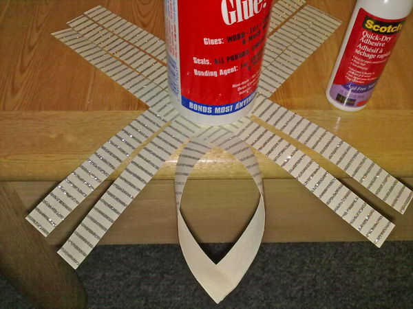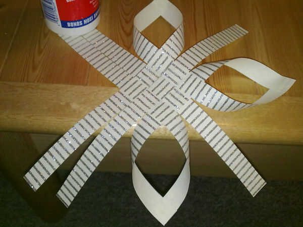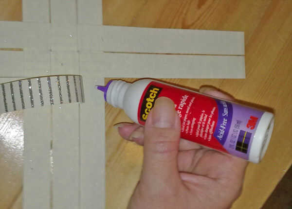 Una vez que sus tiras se tejen como se muestra, usted necesitará pegamento abajo las tiras donde se superponen (ver foto 2). Deje que se seque si es necesario.