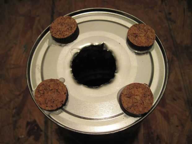 Cortar un corcho del vino en cuatro pedazos y pegar en la parte inferior de la lata.
