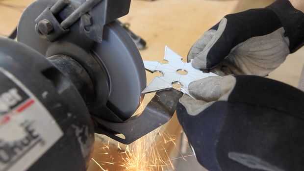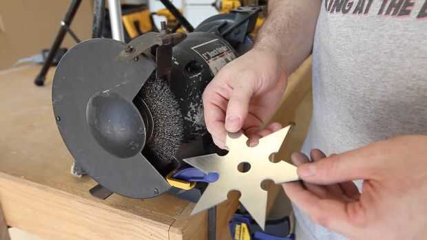 Utilizando una mesa o molinillo de mano, moler la estrella hasta las líneas de su patrón. Esto no toma mucho esfuerzo y realmente hacer la estrella parecerá profesional cuando su acabado. Ir lento y evitar el sobrecalentamiento del metal. Es probable que la plantilla de papel se deje un poco de humo como aprieta. Esto es normal.