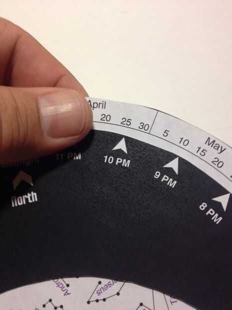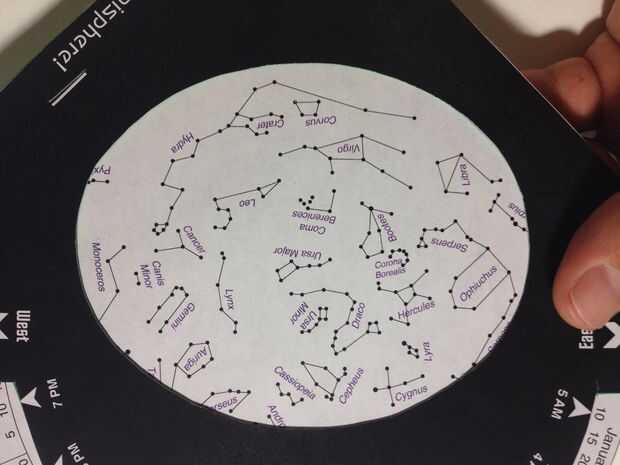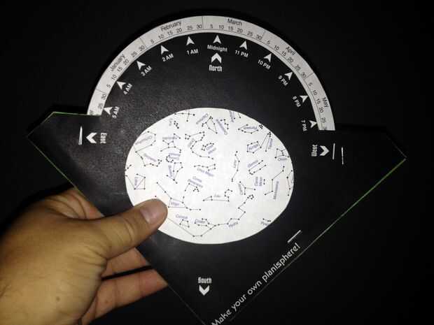 Un planisferio muestra un simple mapa del cielo en cualquier momento de cualquier noche del año. Para configurar el planisferio, gire la rueda dentro de la manga hasta la fecha actual con la hora actual. Las estrellas que se muestran a través de la ventana oval ahora deben ser la sobrecarga de estrellas.