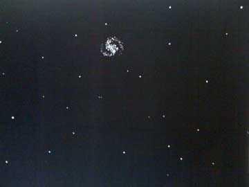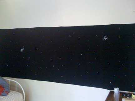 Ahora que tiene una idea donde estarán los marcos de ventana, puede pintar la escena de espacio exterior. Utilice pintura blanca y variar el tamaño de los puntos. Encontré por espaciamiento cada estrella un pie o tan separados y luego volver y clustering unos pocos aquí y allá he podido echar un vistazo más al azar. He añadido una galaxia y un planeta y un cometa. Cuando la pintura blanca seca, fui cada punto con un toque de brillo en la oscuridad.