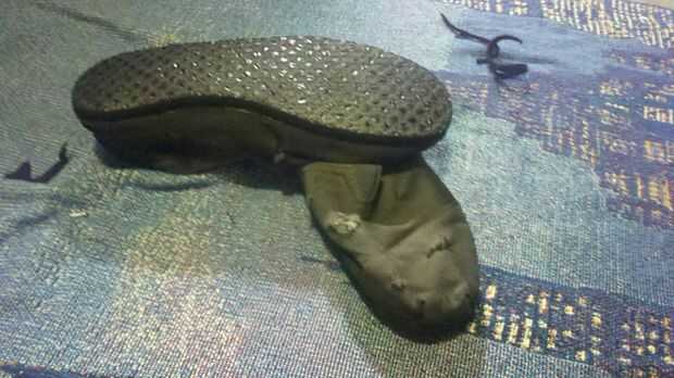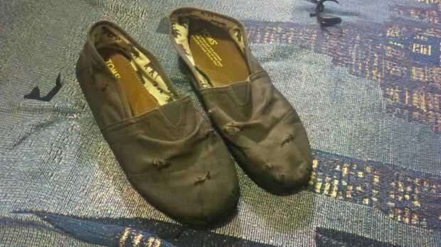 los zapatos son gris de lona de toms. son supuestamente marrón cuero pero no pude encontrar ninguna foto para representar. hacer lo mismo con la pintura y el rasgado de los agujeros para el envejecimiento.