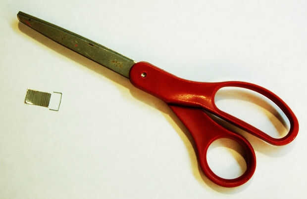 Con unas tijeras, corte un pequeño pedazo de cinta de plata que es aproximadamente 1/2 a 3/4 de pulgada de largo y un poco más estrecha que una grapa.