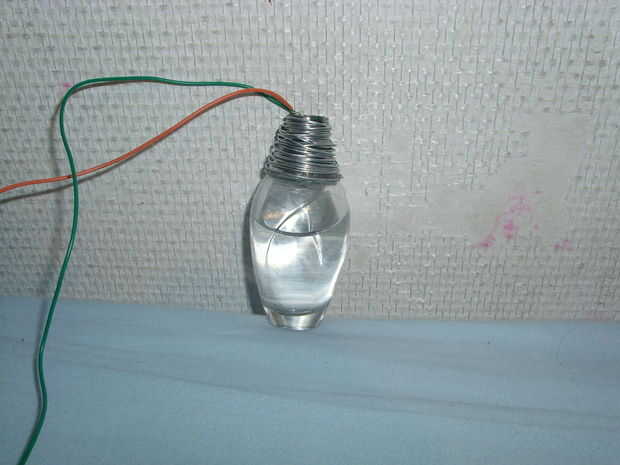 la tercera imagen muestra la botella (terminada) y el reflector con alambre de hierro todo alrededor de él.
